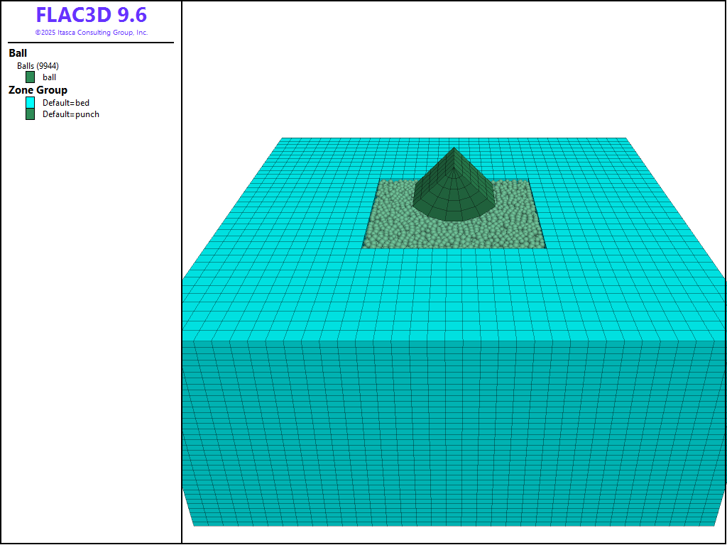 The zone create command is used to create a simple bed of zones and the region that the BPM will occupy is nulled. Since the balls will be created with arbitrary overlap, all gridpoint velocities are fixed while the balls rearrange. The wall-zone create command is used to wrap wall facets around surface zone faces. As seen in Figure 2, the walls do not extend beyond the model domain. An additional wall is created with the wall generate command to enclose the cavity.