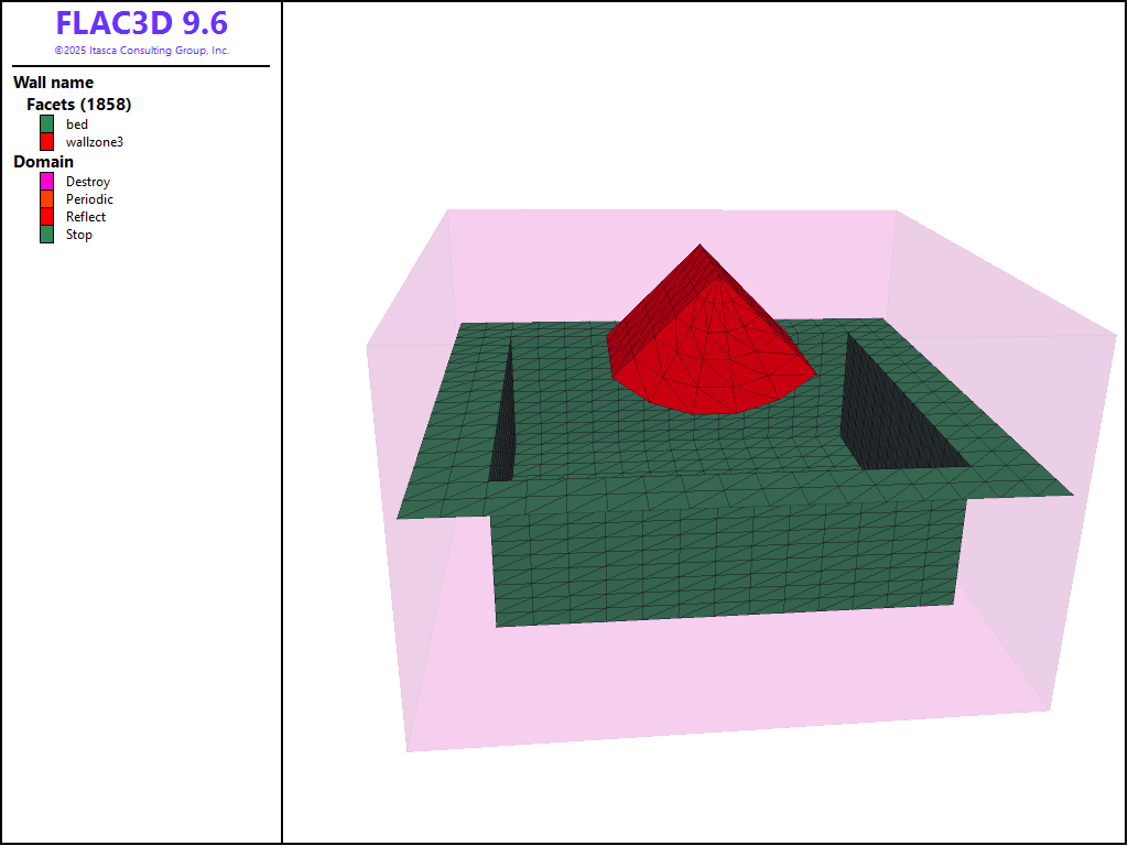 Figure 1 shows the model geometry. A region of zones are nulled and a BPM is created inside this region. Though the BPM region is small and the balls are rather large, this example effectively demonstrates the mechanics of coupling PFC and FLAC3D models. As described in detail in the Wall-Zone Coupling Scheme section, PFC walls are slaved to surface zones. Figure 2 shows the PFC walls and the model domain in which all PFC model components exist. Contacts exist between PFC balls and wall facets; the contact forces and moments at each ball-facet contact are used to determine an equivalent force system to apply to the corresponding zone gridpoints.