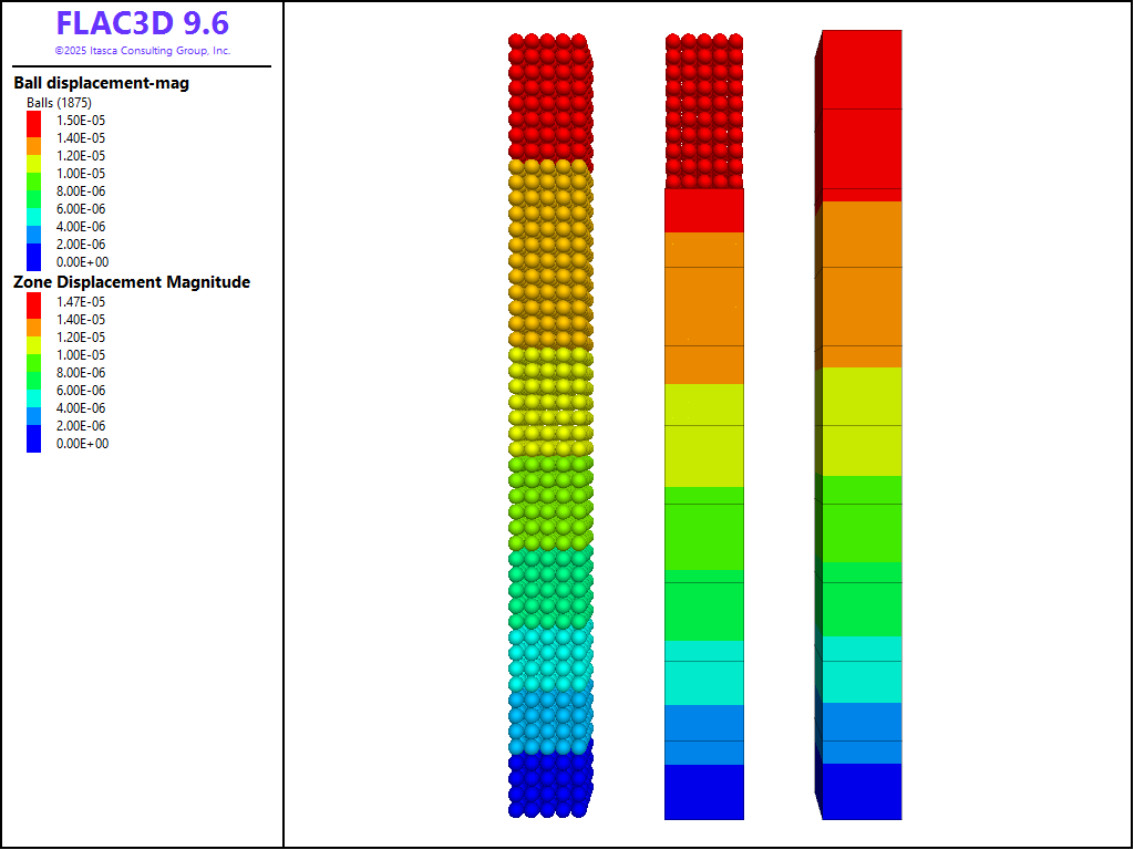 The behavior of the coupled system is compared with a similar system composed of balls alone (PFC-only model), and a system composed of zones alone (FLAC3D-only model). The three systems are run side-by-side in the same model.