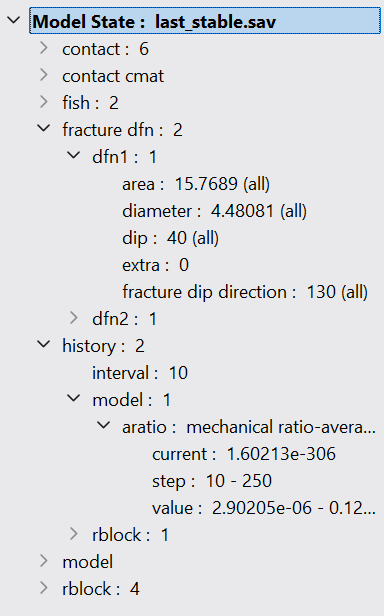 The “Model State” branch of the Objects panel is a tree-form representation of the contents of the current model state—starting with the name of the current saved state file in bold adjacent to the “Model State” label. Items on the tree are presented by name, with a value following (usually either number or max/min values).