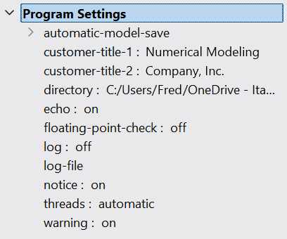 The “Program Settings” branch of the Objects panel tree provides access to program settings, many of which are saved and restored when the code is restarted.