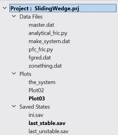 The currently loaded project is shown in bold after the “Project” label at top. A data or plot that is currently loaded in a workspace window is also shown in bold, as is the current saved state.