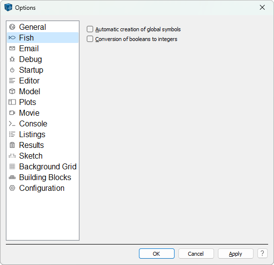 When checked, if an unrecognized name is found while parsing a FISH function, a global symbol is automatically created. If unchecked, global symbols must be explicitly declared using the FISH keyword global.