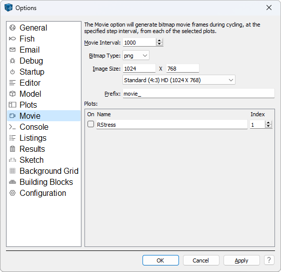 List all the available plots. Individual plots are selected to be made into movies using their check boxes; the Index field is used to specify the starting point for numbering the captured frame files. All captured bitmap files are placed in the current project directory.