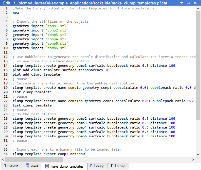 The Editor pane provides features specifically designed to work with Itasca software data files, including: automatic syntax highlighting; collapsible FISH blocks, line numbering, and command-authoring assistance tools. Perhaps most importantly, command processing of a data file’s contents is available from within the pane via the “Execute/Stop” button (