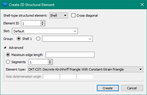 The “Shell-type-structured element:” selection determines which of the three currently available 2D structural element types to create — , , or .