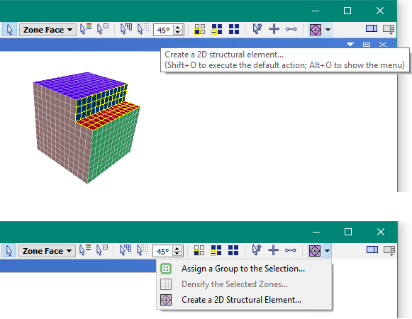 With a zone face selection in the Model pane, choosing the “Create a 2D Structural Element…” command (
