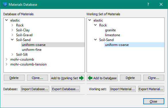 Add to Database - This button copies the selected material, class, or all materials in the selected constitutive model to the database.