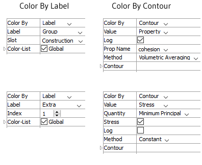 For a number of model objects in FLAC3D, the principal determination in plotting is whether a label (group, extra variable, property, etc.) or a value (acceleration, force, velocity, etc.) of the item is to be shown. In the latter case there will be a scale involved in item coloration (a contour), such that the order of colors is meaningful. For a plot item where the label vs. value determination is decisive, the plot item attributes are set contextually in a top-down fashion: the setting of a given attribute above will determine which additional attributes appear below it. This behavior is usually confined to the first three to five attributes shown.