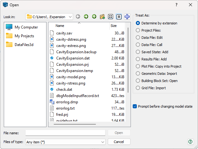 As mentioned above, to “open” something in Itasca software can mean varying things. Selecting an option from this area makes an explicit declaration about what is to occur when the button is pressed.