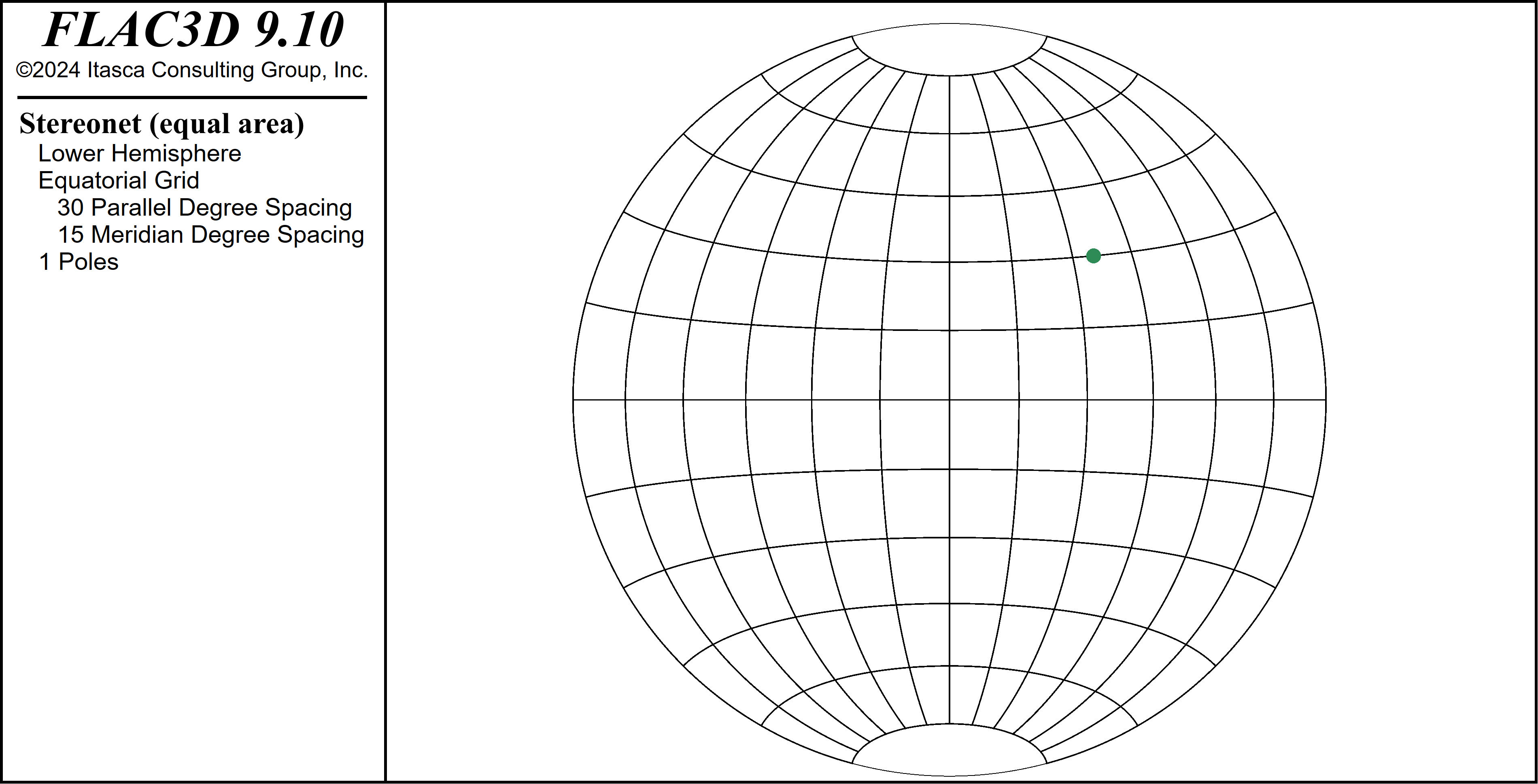 When planar features are plotted on a stereonet, Itasca software display the poles to the planes. So, for example, a Discrete Fracture Network with a Fisher distribution of orientations with a mean dip of 30° and dip direction of 10° will show poles as in Figure 2. It is clear that the stereonet is displaying the normals to the planes with the poles plotting at a dip of about 60 and a dip-direction of about 190.