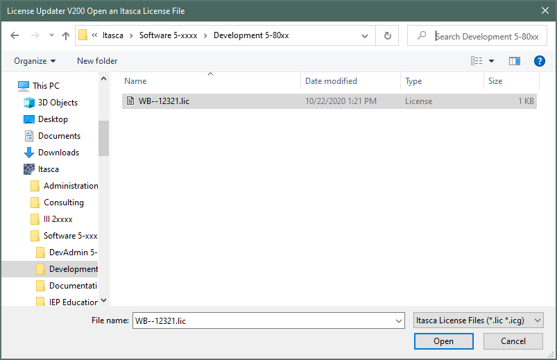 Once Itasca has received the *.req generated by the Request License Change dialog and the sales process for the license change is complete, a license file (*.lic) is sent in return.