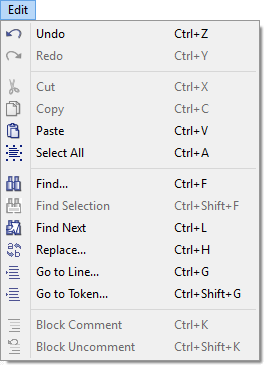 The Edit menu on the main menu appears as below when an Editor pane is active. The commands are enabled/disabled as