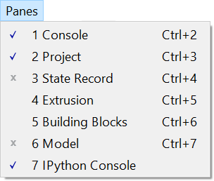Items are not closed from this menu. The checkbox adjacent to an item is an indicator of visibility. Selecting a checked item will not “uncheck” it (that is, “close” it), though it will cause the program to make that pane the active pane in the program. Close a pane using the Close button ( ) on its title bar.