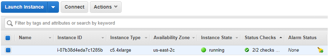 The instance is now listed in a table. When the Instance State is running, and the Status Checks say 2/2 checks …, select the instance and click the Connect button.