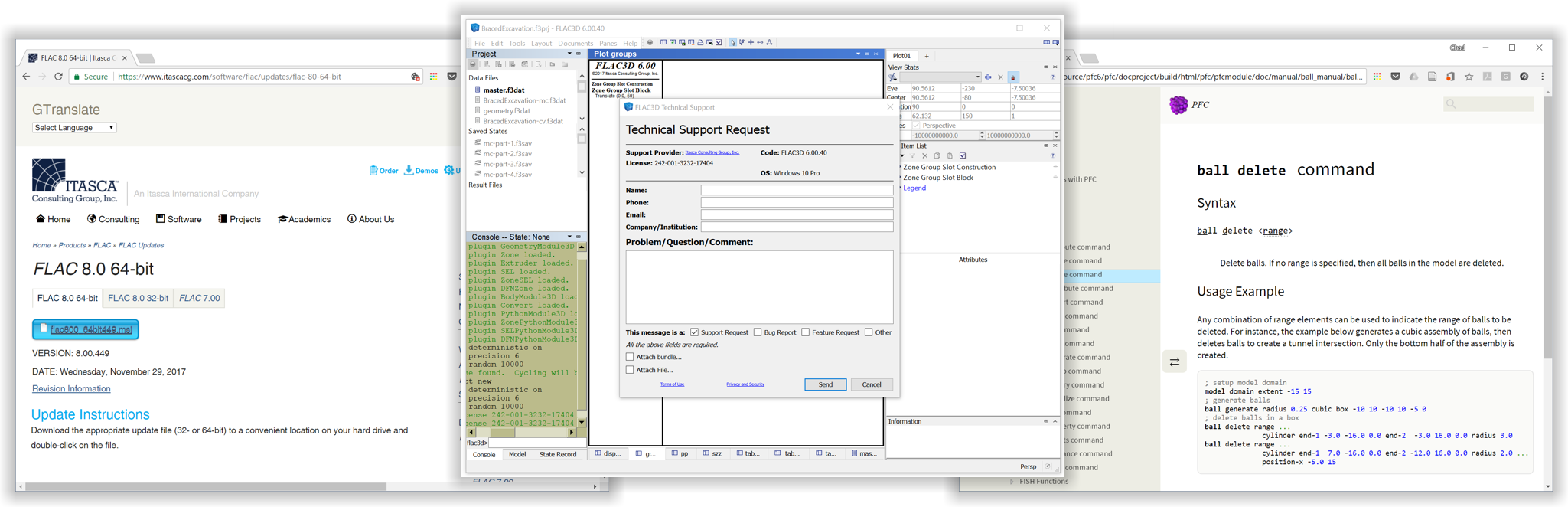 Figure 1: Support for the software comes in many forms, including code updates on the Itasca web site, the Technical Support dialog, and the documentation, which is tightly integrated with the program.
