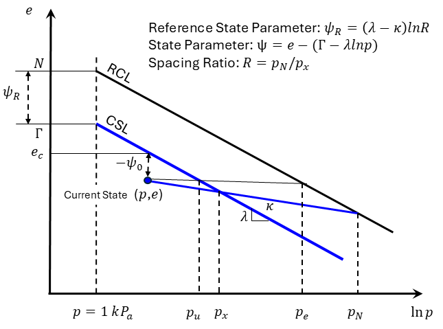 The reference state parameter denoted by \(\psi_R = N - \Gamma\) is the distance between \(N\) and \(\Gamma\) when the critical-state void ratio is at 1 kPa. In the original Cam-Clay (OCC) model, \(\psi_R = \lambda - \kappa\), where \(\lambda\) and \(\kappa\) are the slopes of CSL and the swelling line, respectively, as shown in Figure 1, while in the modified Cam-Clay (MCC) model, \(\psi_R = (\lambda - \kappa)\ln{2}\).