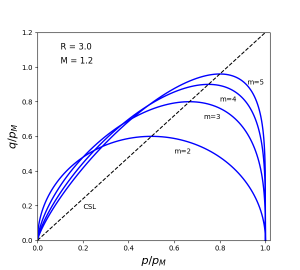 where \(p_M\) must be obtained based on the given stress state \((p,q, \theta)\) by solving \(g=0\) and \(m\) (limited to \(m > 1\)) is a material constant which allows adjusting the desired stress ratio for 1D consolidation. The normalized potential surfaces with various \(m\) are shown in Figure 5.