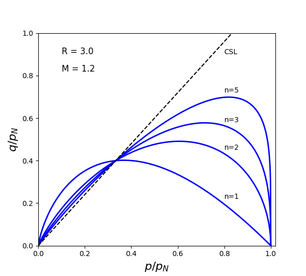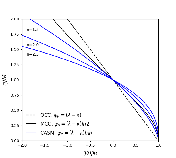 Figure 4: Stress-state relations for original and modified Cam-Clay, and CASM with varying \(n\).