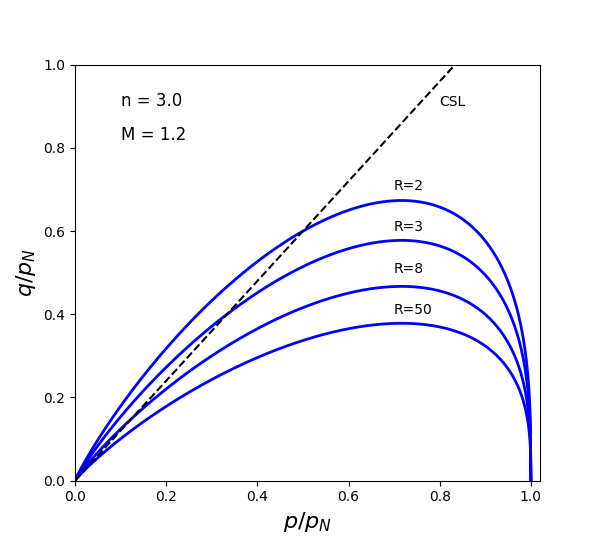If neglecting Lode’s angle effect, the OCC model is recovered by \(\psi_R = \lambda - \kappa\) and \(n=1\), and the MCC model can be approximated by setting \(\psi_R = (\lambda - \kappa) \ln{2}\) and a suitable \(n\) value (Yu, 1998). The stress-state relations for OCC, MCC and CASM are plotted in Figure 4.