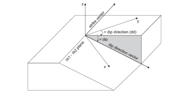 A local system of axes is defined for the joint; axis 3 is normal to the plane, 1 is in the direction of the dip direction vector, and 2, in the direction of the strike.
