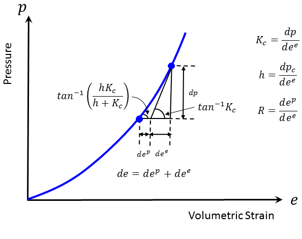 Note that the code sets an upper bound of 0.99 for \(m\). However, it may be interesting to know that in the limiting case of \(m\) = 1, Equation (22) for m < 1 by assuming \(p_c\) = 0 at \(e^p\) = 0 provides a logarithmic law that is similar to the expression used by the Cam-Clay model: