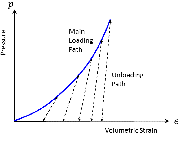The type of behavior exhibited by the double-yield model is illustrated in Figure 1, which shows a nonlinear volumetric loading curve with several unloading excursions; these excursions are elastic, with slope related by \(R\) to the plastic stiffness at the point of unloading.