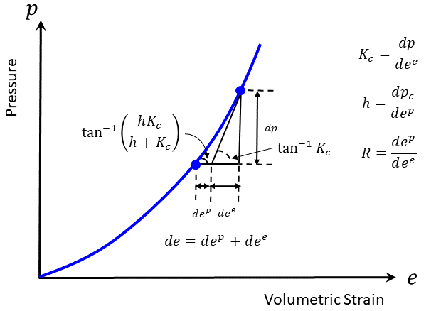 The “hardening curve” and ratio, \(R\), of elastic bulk modulus to plastic bulk modulus are volumetric properties that may be derived from the results of a triaxial test in which axial stress and confining pressure, \(p\), are kept equal. This test (for which \(de^p = de^{pv}\)) is recommended because it is best to determine the parameters related to a particular mode of failure from a test that only involves that failure mode.