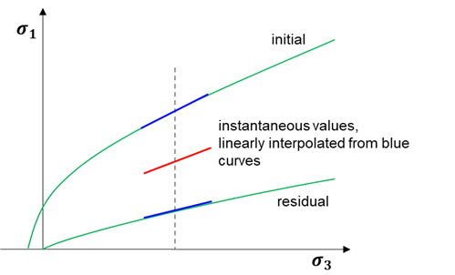 The first residual strength envelope (the blue dash curve in Figure 3, which is referred to as the post-peak envelope in this document) represents the post-peak strength. At this point, the rock mass is assumed to have undergone fracturing, but the resulting rock fragments are still fully interlocked, and hence, porosity is considered to be zero.