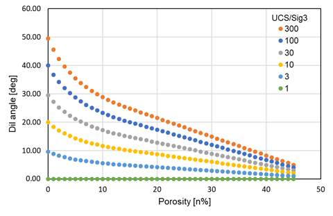 Figure 10: Dilation model in IMASS as a function of confining stress and porosity.