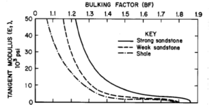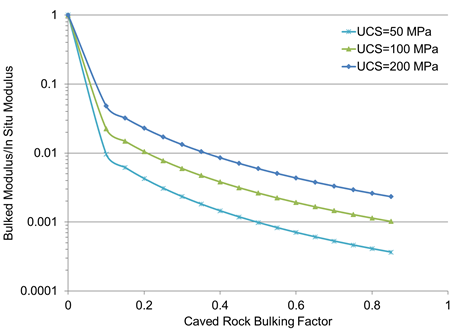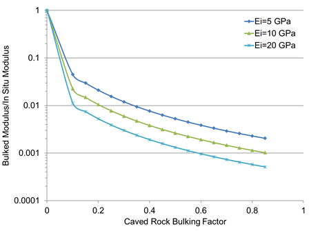The rock mass increases in volume as intact rock blocks fracture, separate, and rotate during the yielding and mobilization process. Along with this bulking, a reduction in modulus is expected to occur. Representation of the decrease in stiffness is crucial for assessing the evolving stress state around the cave and underground openings, because as rock mass dilates/bulks, its potential to carry stress decreases.