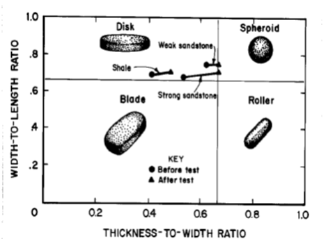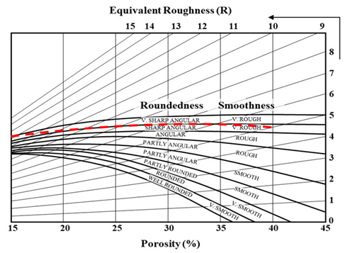 Figure 4: Equivalent roughness of an assembly of rock fragments based on porosity and fragment roundedness/smoothness (Barton & Kjaernsli, 1981).