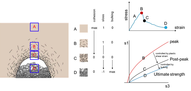 The rock mass response in terms of stress-strain behavior in IMASS is shown in Figure 5, which summarizes the scale used for softening/weakening of the rock mass between peak to post-peak and then between post-peak and ultimate strength envelopes.