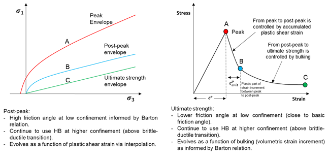 Zero or near zero apparent cohesion and a high friction angle at low confinement for the post-peak envelope, therefore mimicking the cohesion-weakening, frictional-strengthening behavior for the rock mass as it transitions from the peak envelope to post-peak.