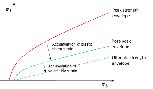 The Hoek-Brown strength envelope only considers the response of the rock mass up to the point of failure. The post peak behavior, which is believed to exert a strong control on rock mass response to stress changes (e.g., due to mining), is not described in this criterion. In order to do this, separate consideration of the post-peak behavior is required.