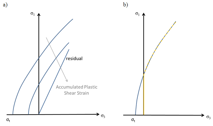 Figure 7: Graphical representation of Hoek-Brown failure envelope with tension weakening: (a) Tensile strength degradation occurring with accumulated plastic shear strain. (b) Sudden loss of tensile strength during tensile failure (yellow line represents tensile shutoff).