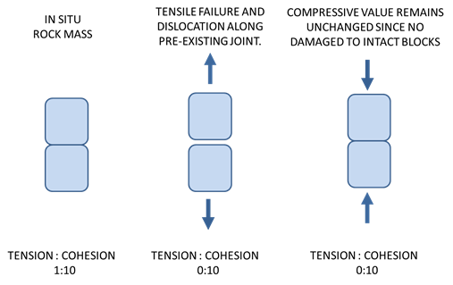 Tensile failure is dominated by the existence of pre-existing fractures in the rock mass. Because there is no consideration of the joint orientation in a strain-softening model, the impact of independent tensile failure due to pre-existing joints must be accounted for in another way. Figure 8 shows how it is feasible that tension can soften independently of cohesion when a tensile failure mechanism is simulated in a rock mass.
