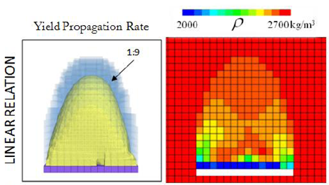 During mining operations such as caving, the rock mass will increase in volume (or bulk) due to dilation under shear, or due to volumetric expansion under tension. Thus, the specification of a dilation angle within the numerical model is important, as it controls the rate of bulking during shearing, which is a natural consequence of advance or differential draw (in caving). Figure 9 shows non-uniform bulking in the mobilized zone as a consequence of the two bulking mechanisms acting simultaneously within the model.