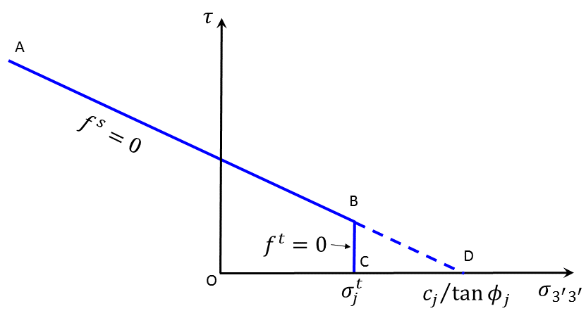 It is possible that \(\sigma_{3'3'}\) is greater than the apex stress (\(c_j/\tan {\phi_j}\)) at an extreme circumstance when \(\phi_j\) is not zero (usually after shear plastic corrections). Once this occurs, the stress will be forced to the apex, or \(\sigma_{3'3'} = c_j/\tan {\phi_j}\) and \(\tau=0\).