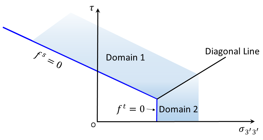 An elastic guess violating the composite yield function is represented by a point in the \(({\sigma}_{3'3'},\tau)\)-plane located either in domain 1 or 2, partitioned by the diagonal line between the lines defined by \(f^s=0\) and \(f^t=0\) (see Figure 2). If in domain 1, shear failure is declared and the stress point is placed on the curve \(f^s\) = 0 using a flow rule derived using the potential function \(g^s\). If in domain 2, tensile failure takes place and the stress point conforms to \(f^t\) = 0 using a flow rule derived using \(g^t\).