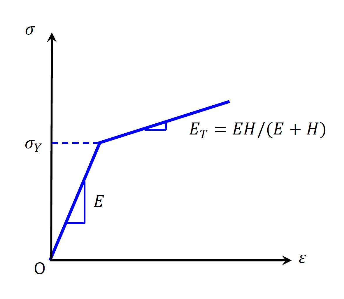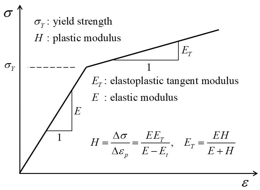 where \(H\) is a material constant called kinematic plastics modulus. See the schematic in Figure 1 for the physical meaning of the plastic modulus in uniaxial loading.