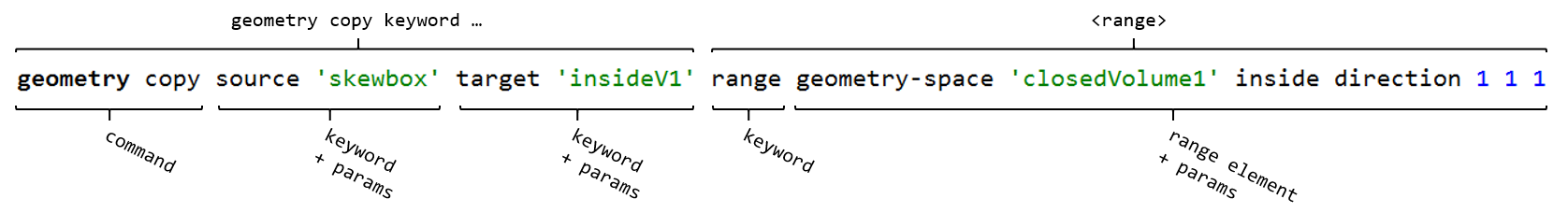 The brackets above the command indicate the command signature of the geometry copy command. The brackets below the command break down this particular instance of the command to its components. Where a command signature indicates a <range> (brackets above), this will always start with the range keyword and contain at least one range element (as broken down in the brackets below). A <range> might also include optional logical keywords or the extent keyword (though neither are shown in the example above).