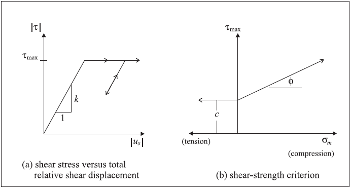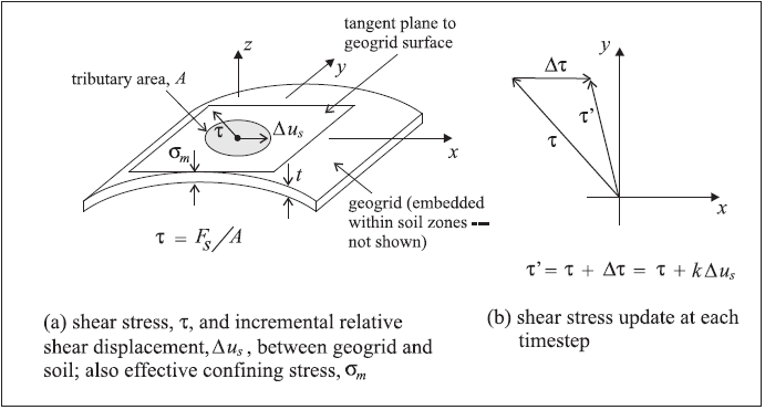 The normal behavior of the geogrid-soil interface is described below. The shear behavior of the geogrid-soil interface (see Figure 3) is cohesive and frictional in nature, and is controlled by the coupling spring properties of (1) stiffness per unit area, \(k\), (2) cohesive strength, \(c\), (3) friction angle, \(\phi\), and (4) effective confining stress, \(\sigma_m\). Note that the coupling-spring properties associated with each geogrid element are averaged at geogrid nodes.