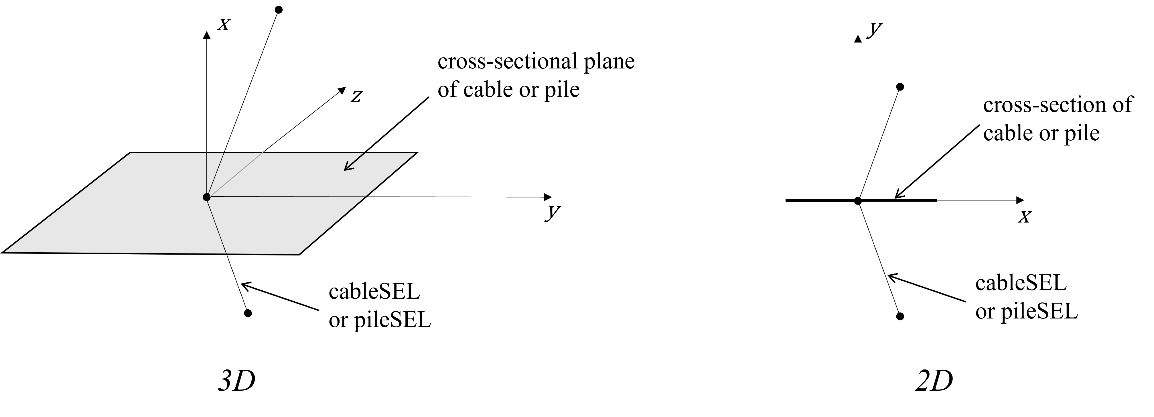 Figure 1: Orientation of the node-local system for a node used by cables or piles in 3D (Left) and 2D (Right).