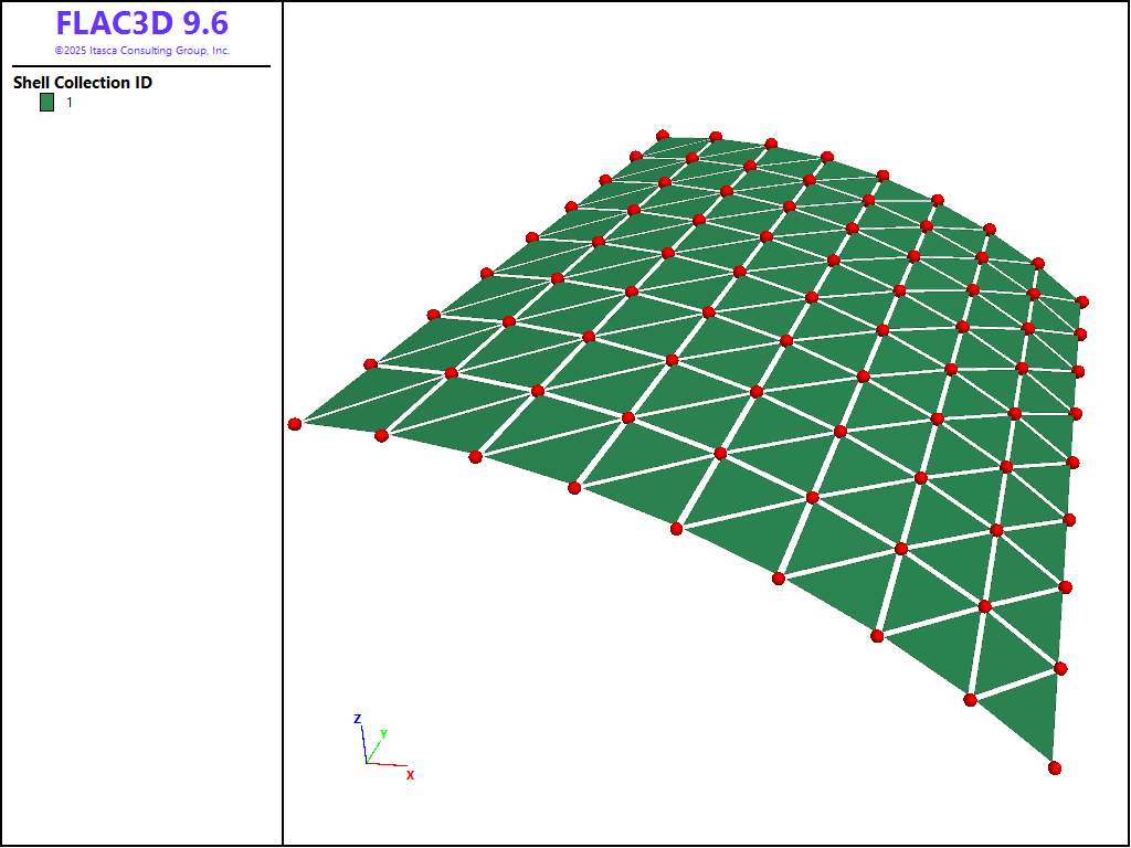 The geometry of shells, geogrids and liners is defined by their corresponding collection of component objects. The creation commands for all three of these types are identical, and for simplicity the following examples will be for shell elements, but they will work just as well for geogrid or liner elements.