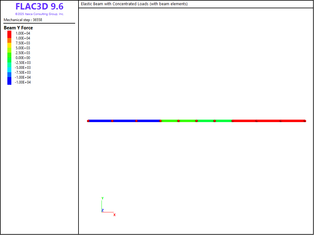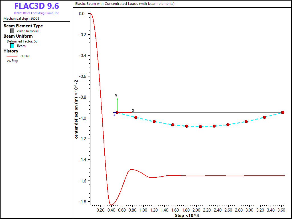 The FLAC3D model consists of 10 beam elements and 11 nodes, as shown in Figure 2. The beam is created by issuing three separate structure beam create by-line commands to ensure that nodes will lie exactly at the beam third points. Also, four elements are created in the middle third to ensure that a node will lie at the exact beam center, so that the displacement of this node can be compared with \(\Delta_{\rm max}\). The beam element coordinate system is aligned with the global coordinate system by setting the direction-y property equal to \((0,1,0)\). Simple supports are specified at the beam ends by restricting translation in the \(y\)-direction. Two point loads acting in the negative \(y\)-direction are applied at the beam third points. The \(y\)-displacement at the plate center is monitored as a history. Local nonviscous damping is used with a damping factor of 0.8. The model is run in small-strain mode to correspond with the small-strain assumption of the analytical solution. The model is cycled until a convergence limit of \(1 \times 10^{-3}\) is achieved.