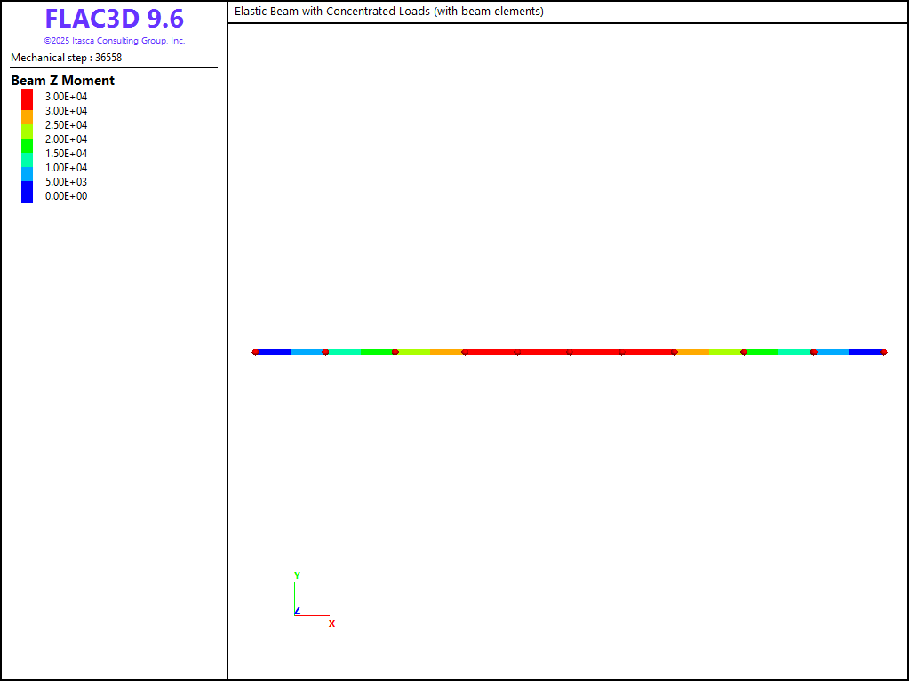 The properties \(\{ A, I_y, J, \nu \}\) are not relevant for this problem; however, they are needed as input for the FLAC3D model. The concentrated loads \((P = 1 \times 10^4 \textrm{ N})\) are applied at the beam third points. For these properties, the maximum midspan deflection is \(15.5312 \textrm{ mm}\).