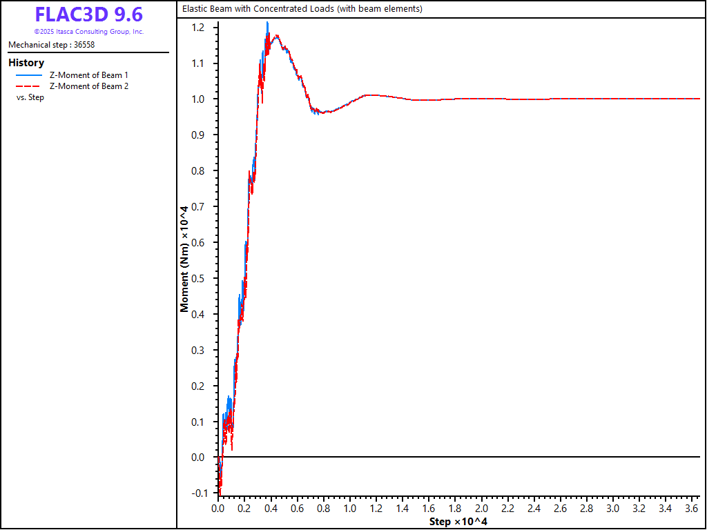 The evolution of bending moment at \(x = 1\) is shown in Figure 7 to reach a steady-state value of \(1 \times 10^4 \textrm{ Nm}\). In this plot, we overlay two histories: one has sampled the moment acting at the right end of element 1 and the other has sampled the moment acting at the left end of element 2. If expressed in a consistent system, these two values should be identical, and the plot demonstrates that they are. This is the case, because the elements making up the beam have a consistent orientation (having been created using the structure beam create command). Note that if we list the moment acting on each element in terms of the global system \((M_z)\) with the command