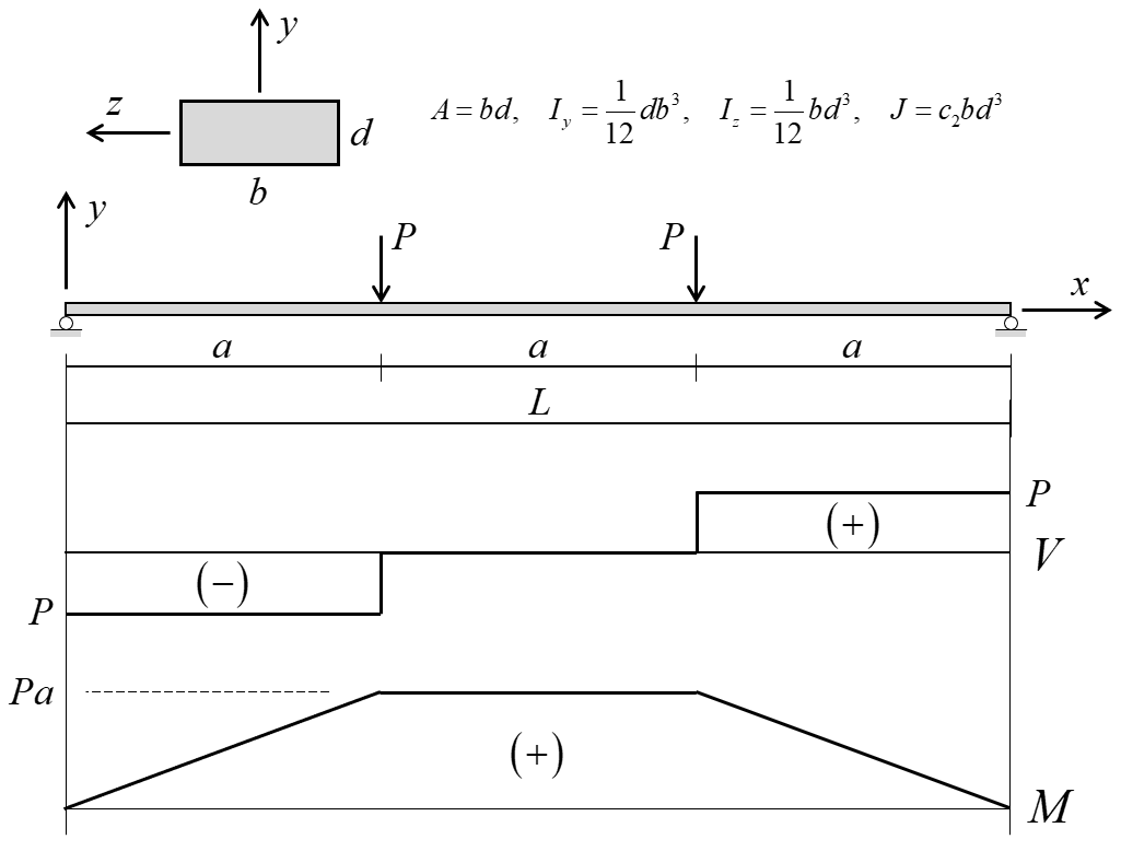 A simply supported beam of rectangular cross section (of width \((b)\) and depth \((d)\)) is loaded by two equal concentrated loads \((P)\) symmetrically placed. The analytical solution for maximum midspan deflection as well as shear-force and bending-moment distributions corresponds with simple beam theory (Euler-Bernoulli beam theory suitable for long thin beams). The maximum midspan deflection is given by AISC (1980, p. 2-116):
