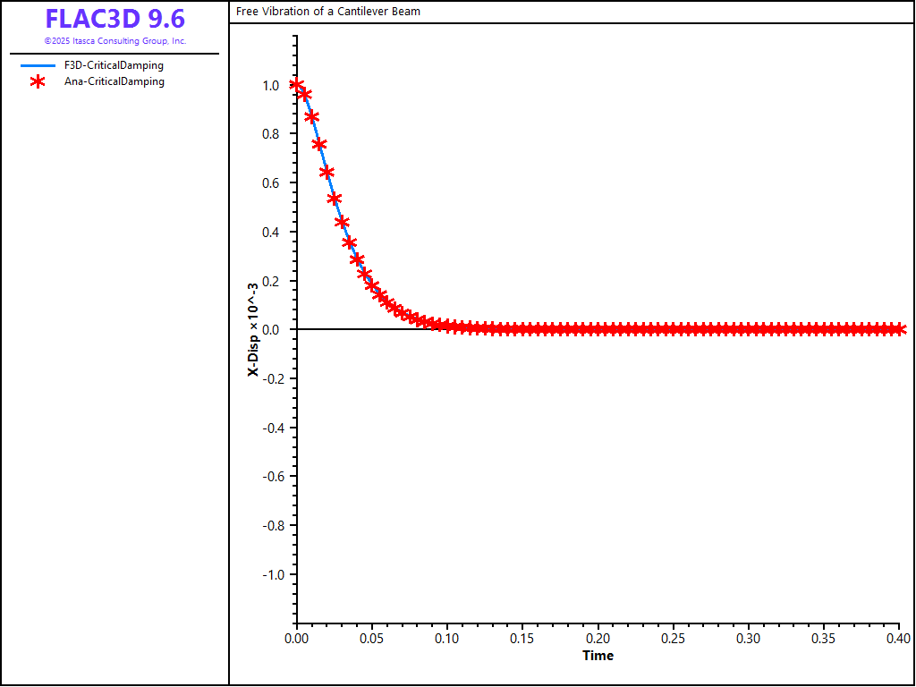 Figure 5: FLAC3D and analytical solution—critical-damping (\(\alpha\) = 40 \(\pi\) or \(\zeta\) = 100%).